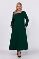Стильное женское платье полуприлегающего силуэта, выполнено из эластичной джинсовой ткани. По переду кокетки с отлетным краем, рельефы, переходящие в линию кармана с листочкой, накладные карманы. Застежка центральная с отрезной планкой на петли и пробивные болты. Спинка со средним швом и талиевыми вытачками. Рукава втачные, одношовные с отрезными манжетами и разрезом по середине. Воротник отложной рубашечного типа. По боковым швам платья и среднему шву спинки настрочные шлевки для пояса, который выполнен из основной ткани. Платье без подкладки.