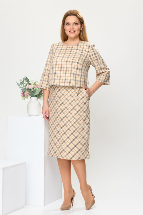 Платье женское полуприлегающего силуэта, длиной ниже колена на 10см предназначено для повседневной носки. Лиф платья отлетной, перед с двумя нагрудными вытачками, спинка цельнокроенная. Лиф платья на подкладке, к которой крепится нижняя часть платья. Переднее полотнище с карманами в боковых швах, заднее с двумя талиевыми вытачками. Горловина круглая, обтачная, без воротника. Рукав втачной, длиной 3/4, одно шовный. Платье с плечевыми накладками. Длина спинки 112см. Длина рукава 43см