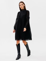 Платье свободной формы из струящейся ткани. Длина миди. Воротник рубашечный. Застежка по переду на кнопки. Длина застежки до талии. По спинке кокетка. В боковых швах карманы. Рукава длинные с манжетой по низу. По передней части рукав с застежкой на кнопки. В комплекте съемный ремень с пряжкой.