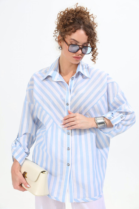 Рубашка прямого силуэта с притачной планкой с застёжкой на петли и пуговицы. Рукав втачной одношовный со спущенной линией плеча с патой. Воротник рубашечный стояче-отложной.