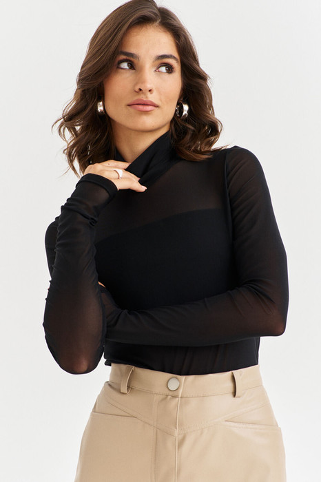 Джемпер прилегающего силуэта, длиной чуть выше линии бедер. По горловине стойка. Рукава одношовные, длинные, втачные. Сетка.