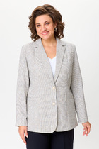 Модель прямого силуэта с центральной застёжкой на петли и пуговицы, без подклада. Воротник пиджачный. Спереди фигурные накладные карманы с клапанами, которые застёгиваются на пуговицу. Сзади кокетка и средний шов. Плечо спущенное. Рукав короткий.
