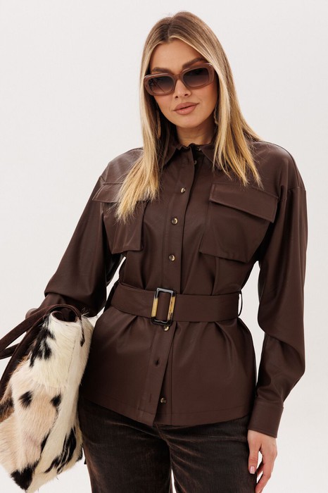 Пояс из той же эко кожи позволяет менять настроение образа - носить рубашку свободно или мягко подчеркнуть талию, создавая более женственный силуэт. Эта модель легко вписывается в гардероб, прекрасно сочетается с джинсами и каблуками, создавая образ, в котором комфорт соединяется с выразительностью. Рубашка, в которой чувствуется уверенность, стиль и особое настроение.
