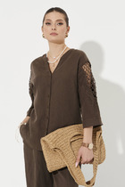 Рубашка свободного кроя. Выполнена из рами. Воротник отложной на стойке.По плечевым швам сборка.Рукав втачной, со спущенной линией плеча, низ на резинке.Спинка цельная.Застежка центральная пуговицы.Низ прямой.Длина рукава от линии втачивания 50 см. Длина спинки 74 см