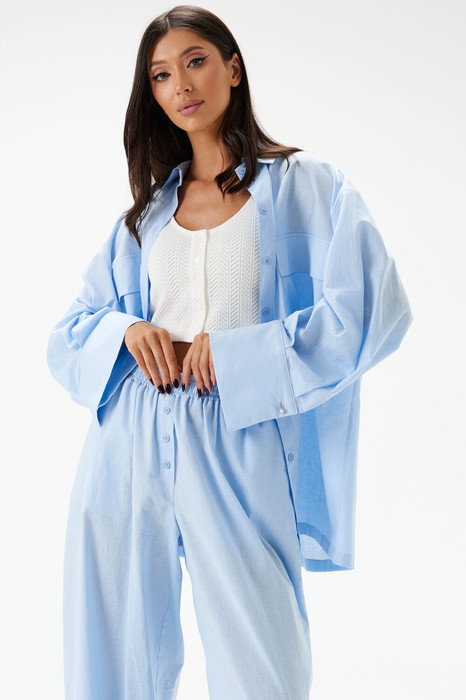 Рубашка прямого свободного кроя выполнена из хлопкового полотна голубого цвета. Характеристики: отложной воротник, застежка центральная на петли пуговицы, рукав расклешен - спущен, по низу рукава широкая манжета на пуговице, по переду нашиты карманы с клапоном, спинка отрезная с декоративной сборкой. Длина спинки 72 см, длина рукава от края горовины 76 см.