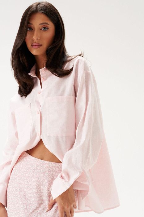 Рубашка свободного кроя. Выполнена из льняного полотна нежно-розового цвета, прямой крой, горловина круглая с отложным воротником на стойке, рукав втачной, немного спущен, с манжетой с пуговичками. В боковых швах разрезы 27 см. Длина рукава от края горловины 71 см. Длина спинки 70 см