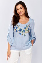 Рубашка прямого свободного кроя. Выполнена из мягкого текстильного полотна светло-серого цвета. Воротник отложной. Застёжка центральная на пуговицы. По переду на уровни линии груди клапаны - имитация карманов на пуговицах. Рукав спущенный, свободный, с манжетой на пуговице. Спинка отрезная. Длина рукава от края горловины 80 см. Спинка отрезная со сборкой. Длина спинки 76 см