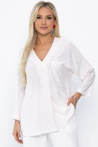 Рубашка из тонкого хлопкового джинса, свободного силуэта, удлиненной спинкой, застежкой на пуговицы спереди и рубашечным воротником. Спинка с отрезной кокеткой и бантовой складкой. Рукав короткий, цельнокроеный. На переде отрезные кокетки и накладные карманы с авторским принтом. Некоторые швы изделия необработаны, при энзимной стирке обретают стильную вытрепанность.