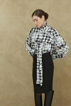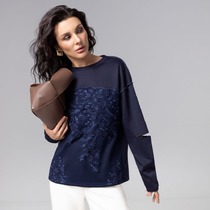 Рубашка из льняной ткани, свободного силуэта, удлиненной спинкой, застежкой на пуговицы спереди и рубашечным воротником. Спинка с отрезной кокеткой и бантовой складкой. Рукав короткий, цельнокроеный. На переде отрезные кокетки и накладные карманы с авторским принтом. Некоторые швы изделия необработаны, при энзимной стирке обретают стильную вытрепанность.