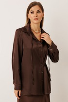 Блуза женская прямого силуэта с цельнокроенными рукавами и притачными манжетами. Застежка цельнокроенная потайная. Воротник на стойке. Низ блузки обметан и подшит.