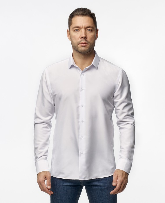 Мужская однотонная рубашка приталенного кроя, с длинным рукавом, застегивается на пуговицы.