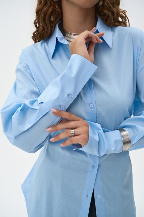 Стильная удлинённая рубашка прямого кроя с акцентом на талию.