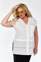 Блузка выполнена из плательно-блузочной ткани. Блузка прямого силуэта покроя оверсайз, длиной до линии бедер. Спереди центральная застежка до верха на пуговицы. Спинка цельная. Горловина округлой формы со стояче-отложным воротником. Плечевой шов спущенный. Рукав рубашечного покроя, одношовный. Низ рукава на притачной манжете. В боковых швах разрезы.