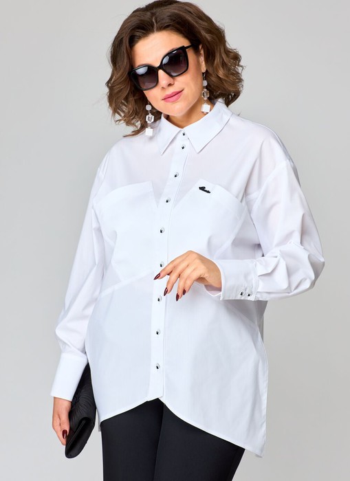 Блуза женская повседневная прямого силуэта с фигурным низом выполнена из хлопка. Вырез горловины воротник на стойке рубашечного типа, застежка доверх на обметанные петли и пговицы. Рукав спущенный, втаной на притачной манете, в боковых швах обработаны разрезы. На полочках два накладных кармана. по спинке фигурная кокетка и встречная складка. декором служат отделочные элементы, декоративные пуговицы и металличека лейба на кармане.