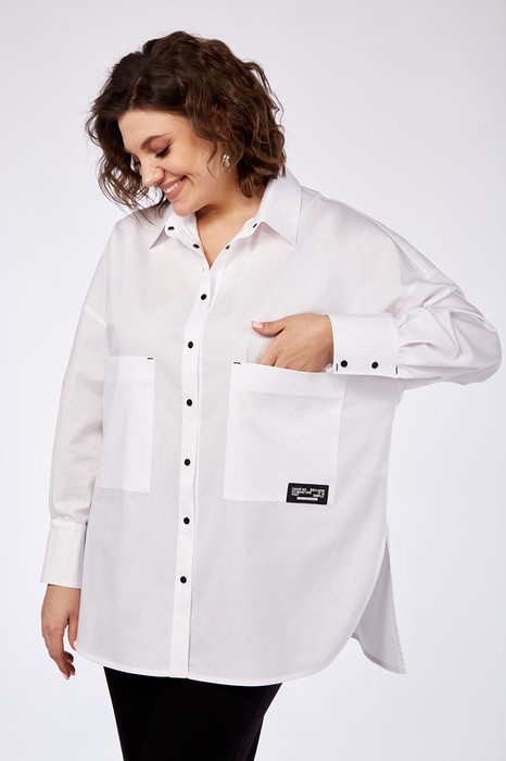 Блузка женская свободного силуэта из блузочной ткани.  Воротник стояче-отложной, застежка — планка на кнопки. По спинке кокетка и складка. Плечо спущенное, рукав длинный со складками, внизу высокий манжет с застежкой на кнопки. По переду  накладные карманы с нашивкой на одном из них. По боковым швам внизу высокие разрезы.