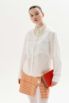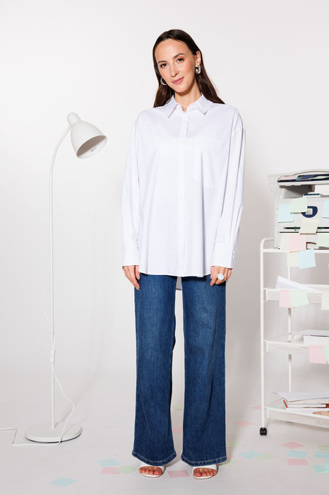Базовая блузка из хлопковой ткани. Это имена та блузка которую можно носить несколько сезонов и она не потеряет свою актуальность. Универсальность – главное преимущество этой блузки. Блузка силуэта оверсайз, что идеально подходит для разного типа фигуры. Спинка блузки удлиненная. Блузка с фигурным низом и разрезами по боковым швам. Застежка сквозная на потайные петли и пуговицы. Воротник рубашечного типа. Рукава широкие рубашечные, с высокими манжетами. По переду на левой детали имеется нагрудный накладной карман. Спинка с горизонтальной кокеткой. От кокетки расположена глубокая бантовая складка. Вся внутренняя обработка изделия швами с закрытыми срезами. Отличный модный вариант блузки как в офис, так и для повседневных дней в сочетании с любимыми джинсами. Длина изделия – 75 см.