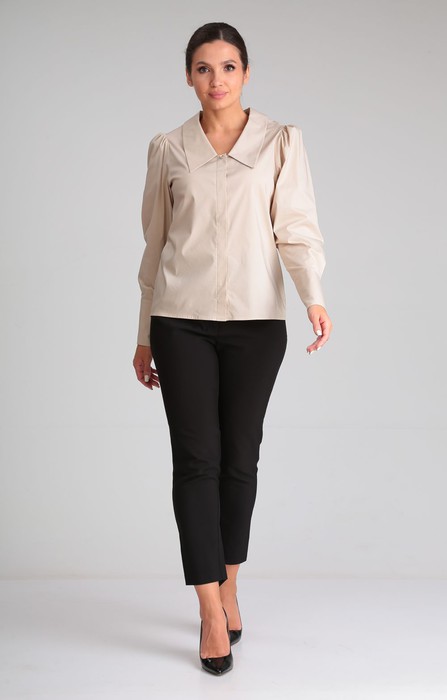 Стильная блузка прямого силуэта из ткани содержащей хлопок. Изделие с горловиной V-образной формы и отложным воротником. Передняя часть блузки с потайной застежкой на пуговицы и одной декоративной пуговицей. Рукав втачной со сборкой по окату и притачной широкой манжетой с застежкой на три пуговицы. Спинка изделия цельная.