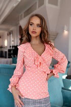 Стильная укороченная женская рубашка свободного силуэта с кокетками спинки и полочек и спущенной линией плеча. Застежка на планку петля-пуговица. Рукав длинный прямой, втачной с манжетой на застёжку петля-пуговица. По низу изделия притачной пояс со шнурком для стяжки и завязывания. По воротнику, по кокеткам и по плечевым швам отделочная строчка. На модели размер 48 (параметры модели ОГ-90. ОТ-71. ОБ-102 рост 173см)