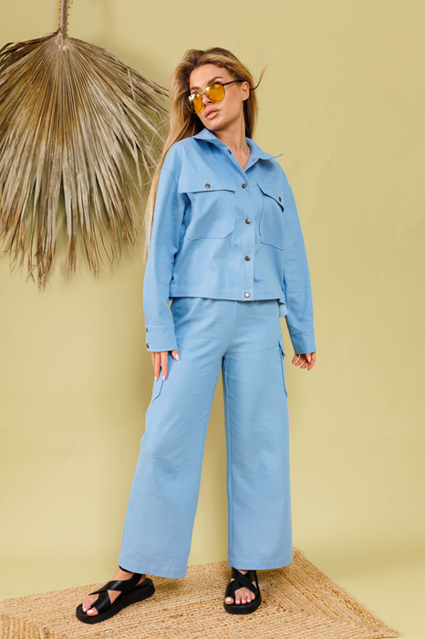 Укороченная рубашка из хлопка прямого кроя со спущенной линией плеча. Горловина обработана рубашечным воротником с отрезной стойкой. Застёжка центральная на кнопки. Есть нагрудные карманы и в боковых швах. Низ рукава обработан притачной манжетой, застёгивается на кнопки. Изделие без подкладки.