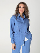 Блузка женская свободного силуэта выполнена из легкой хлопковой ткани. Горловина с отложным воротником на стойке. Застежка центральная на петли и пуговицы. Спереди в верхней части накладные карманы. Спинка с кокеткой и складкой из-под кокетки. Плечо спущенное, линия поймы углубленная. Рукава длинные на манжете, с застежкой на петлю и пуговицу.  Линия низа блузки фигурная.