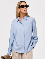 Рубашка— не просто верх, а главный акцент. Кожа, плотная, но податливая, образует «оверсайз» силуэт. Плечо, от места втачивания воротника и до вытачки по рукаву, украшены декоративными косичками из кожаных тесёмок. По переду рубашки застёжка на декоративные пуговицы в тон ткани по планке, и накладные карманы. Воротник рубашечного типа. Линия плеча спущенная. Спинка в рубашке с отрезной кокеткой. Рукав втачной, длинный с локтевым швом и разрезом от низа; заложенной складкой от низа и притачной манжетой. Низ в рубашке ассиметричный. Длина рубашки по спинке 81 см. Длина рукава рубашки 52 см.