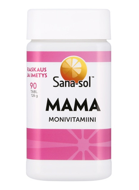 Sana-sol Mama содержит все, что необходимо вашему организму во время беременности и грудного вскармливания. Sana-sol Mama содержит 12 витаминов и 9 минералов, включая кальций, магний, витамин D и фолиевую кислоту. Sana-sol Mama не содержит витамин А. Начинайте использовать продукт во время планирования беременности и продолжайте во время грудного вскармливания. Ингредиенты: Минералы (кальций, магний, цинк, железо, марганец, медь, хром, йод, селен), мальтодекстрин, наполнители (микрокристаллическая целлюлоза, сшитая карбоксиметилцеллюлоза натрия), витамины (витамин С, витамин Е, ниацин, пантотеновая кислота, витамин В6, рибофлавин), тиамин, фолиевая кислота, витамин К, биотин, витамин D (D3), витамин B12), вещества для обработки поверхности (магниевые соли жирных кислот, гидроксипропилметилцеллюлоза, шеллак, карнаубский воск), увлажнитель (глицерин), красители (диоксид титана, оксиды и гидроксиды железа). Не содержит лактозы и глютена. Рекомендуемая суточная доза: 3 таблетки в день во время еды. Таблетки можно принимать во время одного приема пищи или разделить на несколько приемов. Количество активных ингредиентов на 3 таблетки. Витамины: Витамин D 10 мкг (200%*) Витамин Е 12 мг (100 %*) Витамин К 75 мкг (100 %*) Витамин С 150 мг (150 %*) Тиамин (витамин B1) 1,1 мг (100 %*) Рибофлавин (витамин B2) 1,4 мг (100 %*) Ниацин (витамин B3) 16 мг (100 %*) Витамин B6 (пиридоксин) 1,4 мг (100 %*) Фолиевая кислота 500 мкг (250 %*) Витамин B12 2,5 мкг (100 %*) Биотин 50 мкг (100 %*) Пантотеновая кислота (витамин B5) 6,0 мг (100 %*) Минералы Кальций 800 мг (100 %*) Железо 20 мг (143 %*) Магний 300 мг (80 %*) Цинк 15 мг (150 %*) Медь 1000 мкг (100 %*) Магний 2,0 мг (100 %*) Селен 55 мкг (100 %*) Хром 40 мкг (100 %*) Йод 150 мкг (100 %*) *От эталонного значения для Савана Страна-производитель: Дания