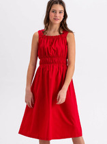 Сарафан свободного кроя,со складками по низу, отделкой контрастным атласным кантом по линии кокетки на переди и по линии складок. С бантиком из атласа,с застёжкой на молнии по спине.Сзади складок нет две выточки: