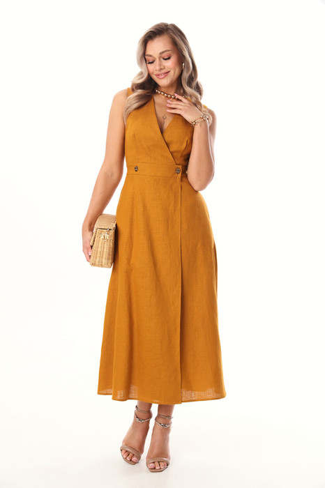 Сарафан "макси" без рукавов с застёжкой на запах на функциональные петли и пуговицы. Вырез декольте V-образный. По линии талии спинки эластичная вставлена эластичная резинка. При надобности, платье легко слегка расширить или заузить по талии, переставив пуговицы.