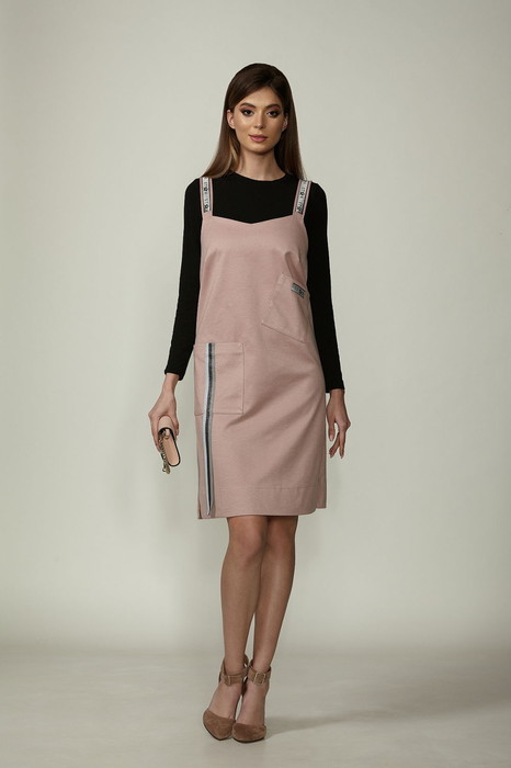 Сарафан из плотной костюмной ткани на подкладке. Силуэт прямой.  По переду - нагрудные вытачки и два накладных кармана. Бретели  и карманы сарафана декорированы лентой. Металлическая застежка-молния в среднем шве спинки.