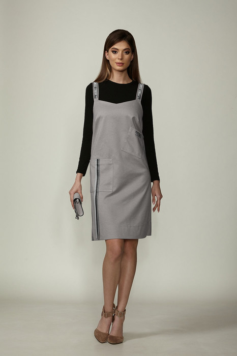 Сарафан из плотной костюмной ткани на подкладке. Силуэт прямой.  По переду - нагрудные вытачки и два накладных кармана. Бретели  и карманы сарафана декорированы лентой. Металлическая застежка-молния в среднем шве спинки.