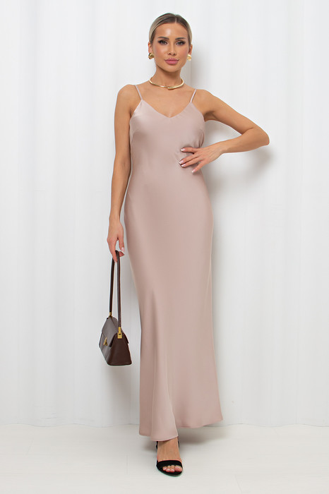 Элегантное длинное платье полуприлегающего силуэта. V-образная горловина по переду и спинке на внутренней обтачке. Тонкие брители с регулируемой высотой.