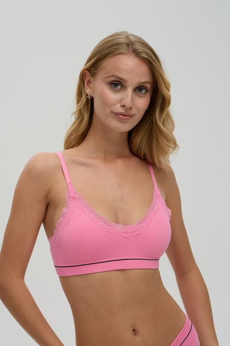 Бюстгальтер формы Soft bra с мягкими чашками, без каркасов и боковых корсетных вставок, выполнен из нежного материала в рубчик. Подклад в передней части и съемные формованные чашки. Эластичное кружево по верхнему срезу и резинка, с вывязанной полоской контрастного цвета, украшают изделие. Однотонные регулируемые бретели не отстегиваются. Без застежки.