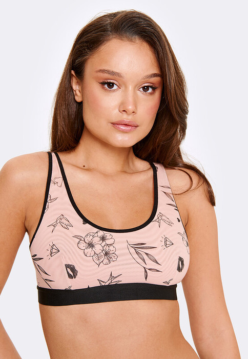 Дерзкая снаружи, нежная внутри. Сочетаем несочетаемое в белье Sensera. Бюстгальтер- топ выполнен из мягкой сетки телесного цвета с трендовым принтом-татуировками. Принт не выцветает, не стирается и долго радует глаз. Мягкие чашки без косточек и push up созданы для абсолютного комфорта. Широкие бретели, широкая лента под грудью и застежка на 2 крючка обеспечивают оптимальную посадку.