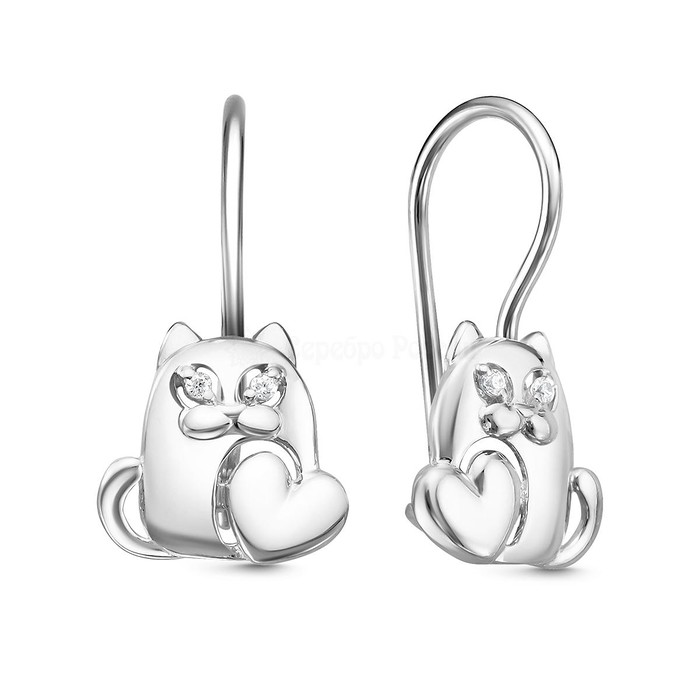 Серьги детские из серебра с фианитами родированные - Кошечки с сердцами