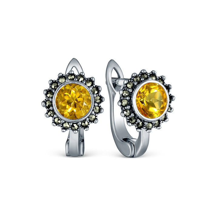 Серьги из чернёного серебра с натуральным цитрином и марказитами 925 пробы HE175