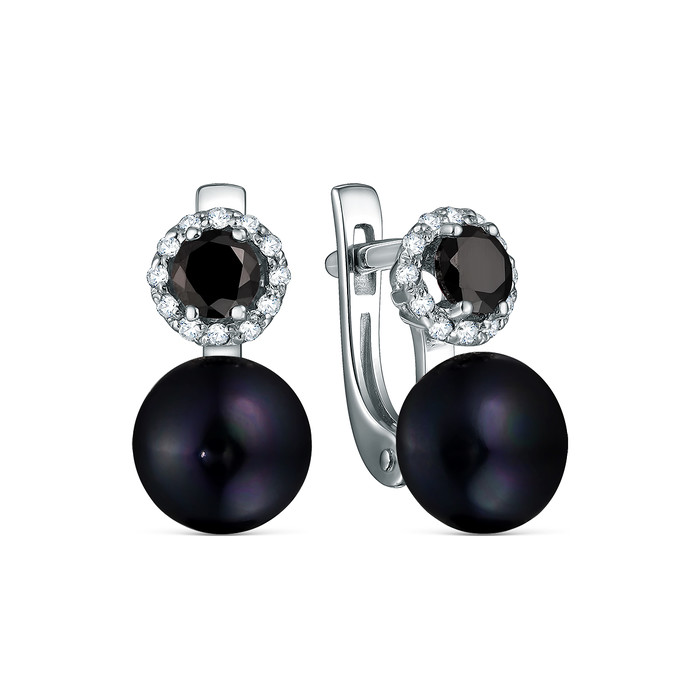 Серьги из серебра с культивированным жемчугом и фианитами родированные 925 пробы