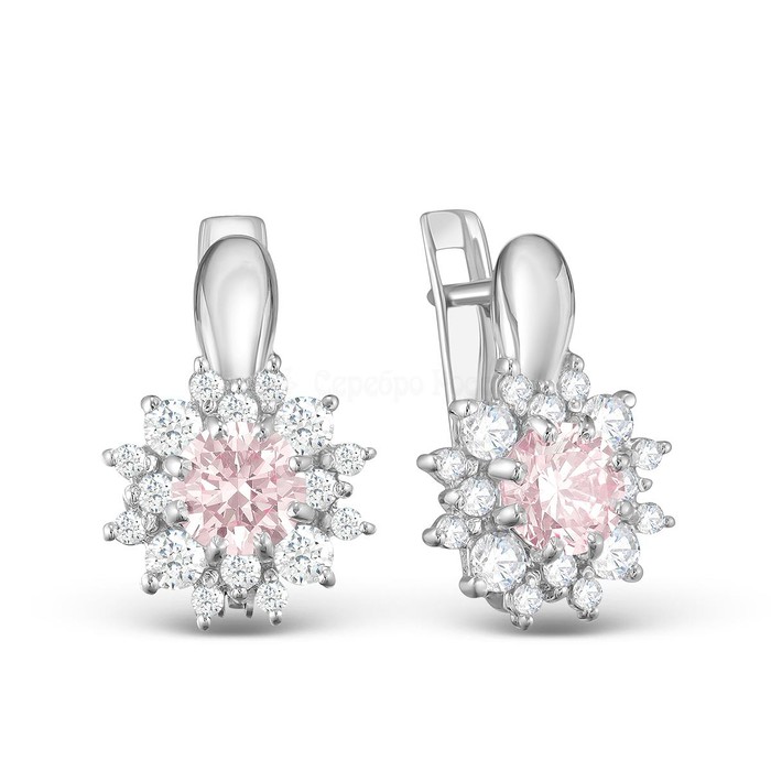 Серьги из серебра с розовым бриллианитом и фианитами родированные
