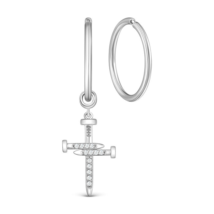 Серьги-конго женские с гвоздиками в виде креста из серебра с фианитами родирован