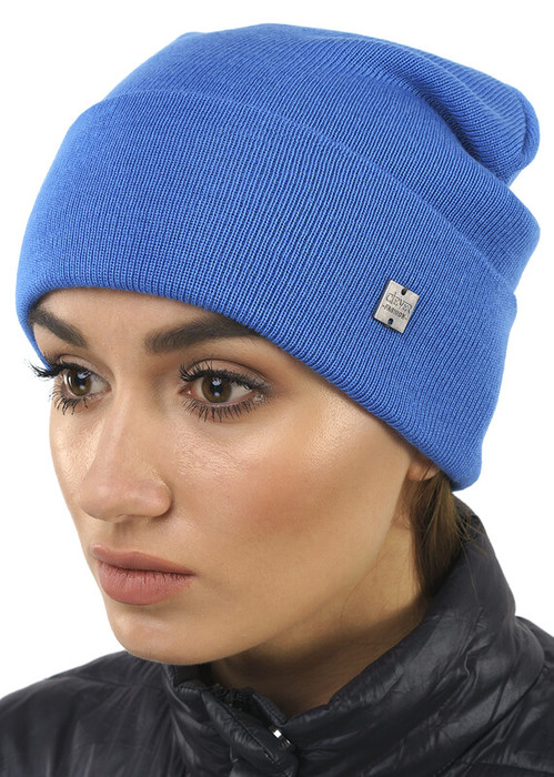 Шапка, связанная гладью, с отворотом, с небольшим напуском, декорирована имиджевой логотипом-нашивкой, без утепления на флисе. Размер 58.