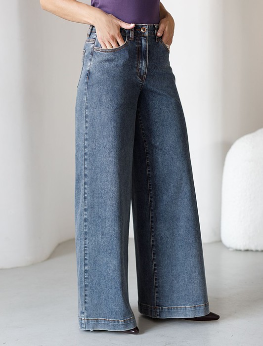 Состав: 73%Хлопок 25%ПЭ 2%ПУ Плотность: 12,2 OZ Параметры модели на первом фото: Рост 172, бюст 81, талия 59, бедра 88 Размер товара на первом фото: 42Стильные расклешенные джинсы благородного серо-синего цвета из эластичного денима плотностью 12,2 OZ созданы для современного образа и максимального комфорта. При производстве джинсов применена технология «вареные швы», которая основана на локальном вымывании красителя из плотных участков ткани — сгибов и швов — за счет механического воздействия во время промышленной стирки. Стоун вошинг - энзимная стирка с камнями. Камни воздействуют на ткань, выбивая краску на швах, создавая контрастные мраморные потертости и мягкость. Премиальный материал обеспечивает надежность и приятные ощущения при носке, а добавление эластичных волокон делает посадку особенно удобной. Высокая талия и расширенный крой к низу визуально вытягивает рост и подчеркивает достоинства, делая силуэт женственным, а декоративная стирка добавляет акцент. Эти широкие джинсы - оличное решение для девушек размера полюс сайз. Детали продуманы до мелочей: мягкий пояс не сдавливает живот, задние карманы и шов расположены на правильном уровне, что бы визуально подтянуть фигуру, а плотный джинс сохраняет форму после длительной носки и частых стирок.