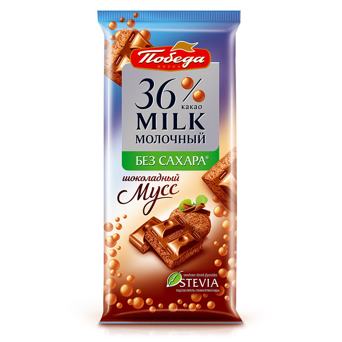 Пористый шоколад 36 % какао «Шоколадный мусс» – настоящий полет кондитерской мысли. В этой плитке пузырьки вспененной шоколадной массы сначала расширяются, а затем сохраняются при охлаждении. В результате мы получаем воздушную нежнейшую текстуру мусса и необыкновенную легкость. В этом рецепте легкости еще больше потому что мы заменили сахар на натуральный сахарозаменитель – стевиолгликозид. Стевиолгликозид – очищенный экстракт растения стевии (Stevia rebaudiana), который придает листьям сладкий вкус. Растение стевия родом из Южной Америки. Это уникальный природный сахарозаменитель, не имеющий аналогов, благодаря особенной сладости и натуральному происхождению. Ваш любимый вкус и еще больше пользы. А в основе – всеми любимый молочный шоколад «Победа» 36 % какао!