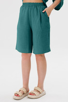 Шорты свободного силуэта с притачным поясом на резинке. В боковых швах угловые карманы.