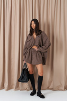 Шорты свободного кроя. Выполнены из текстильного полотна кофейного цвета в полоску. А-силуэт. Пояс на резинке. По передней части имитация застежки на 3 пуговицы. Карманы-хулиганы. По передней и задней части вертикальные швы. Длина 37 см