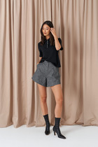 Шорты свободного кроя выполнены из ткани графитового цвета. Характеристики: прямой крой, брендированная подкладка, пояс стабильный, застежка молния пуговичка, боковые карманы. Длина по боковому шву - 37 см.