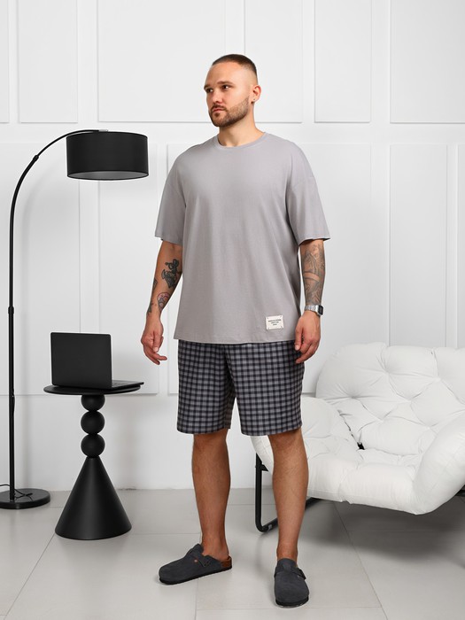 Шорты в мелкую клетку из трикотажной "фланели". Модель средней длины, на цельнокроеном поясе с эластичной тесьмой внутри, с карманами в боковых швах.