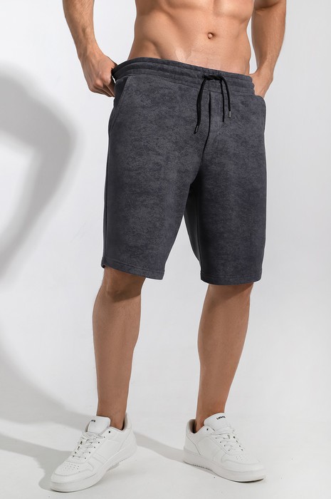 Шорты мужские из трикотажного полотна "футер-трехника -петля", на притчном поясе с эластичной тесьмой внутри, с карманами в боковых швах и имитацией застежки "гульфик". В центре пояса - две обметанные петли, чере которые продет шнурок с наконечниками для регулирования степени прилегания шорт по талии.