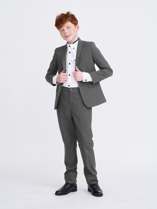 Классический костюм для мальчика  из износостойкой и устойчивой к смятию костюмной поливискозы. Пиджак полуприлегающего силуэта с английским воротником, боковыми прорезными карманами с клапаном. Дополнен нагрудным прорезным карманом с листочкой и тремя нарукавными пуговицами. Застёгивается на две пуговицы. Брюки прямого силуэта немного зауженные к низу, со стрелками, боковыми карманами и прорезными задними карманами с клапаном, на втачном поясе с регулировкой и шлёвками.
