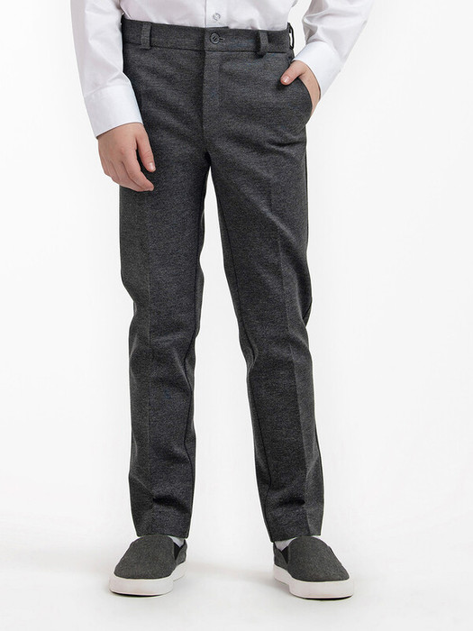 Брюки зауженные из трикотажа джерси для мальчика. Пояс с еврорезинкой сзади. На передней части брюк боковые карманы, горизонтальные защипы  и застёжка - гульфик на молнии. На правой задней половинке брюк - карман с узкой листочкой. Отличный вариант на каждый день.