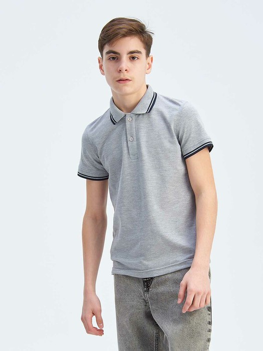 Поло из 100% хлопка с короткими рукавами, отложным воротником рубашечного типа, с центральной укороченной застежкой по переду на пуговицы. По краю воротника и на манжете рукава расположена контрастного цвета полоса.