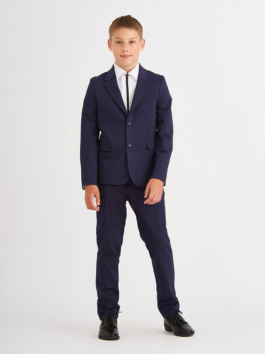 Классический костюм 2-йка для мальчика из трикотажа. Пиджак полуприлегающего силуэта с английским воротником и длинными втачными рукавами. Дополнен прорезными карманами с клапаном. Застегивается на 2 пуговицы. Брюки зауженные на поясе с еврорезинкой сзади. В боковых швах расположены карманы, горизонтальные защипы и застёжка - гульфик на молнии. Сзади расположены карманы с листочкой.